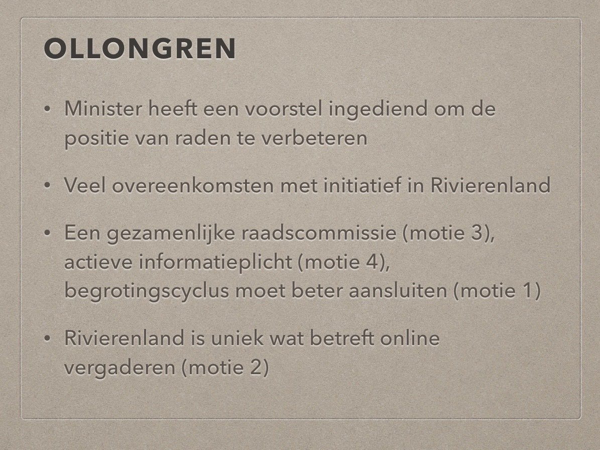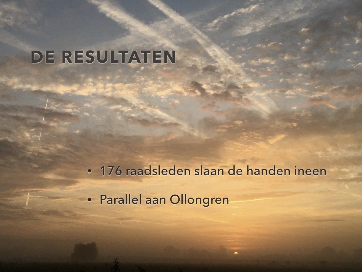 We koppelen vanavond terug wat de resultaten zijn van de 4 moties die we hebben voorgelegd aan 8 raden. Wat is er in de tussentijd mee gedaan? Verder blikken we vooruit naar 2020 en gaan we in gesprek over dit initiatief met de directeuren van enkele gemeenschappelijke regelingen. Hoe hebben zij dit initiatief ervaren? Maken zij zich zorgen? Zien zij ook voordelen?